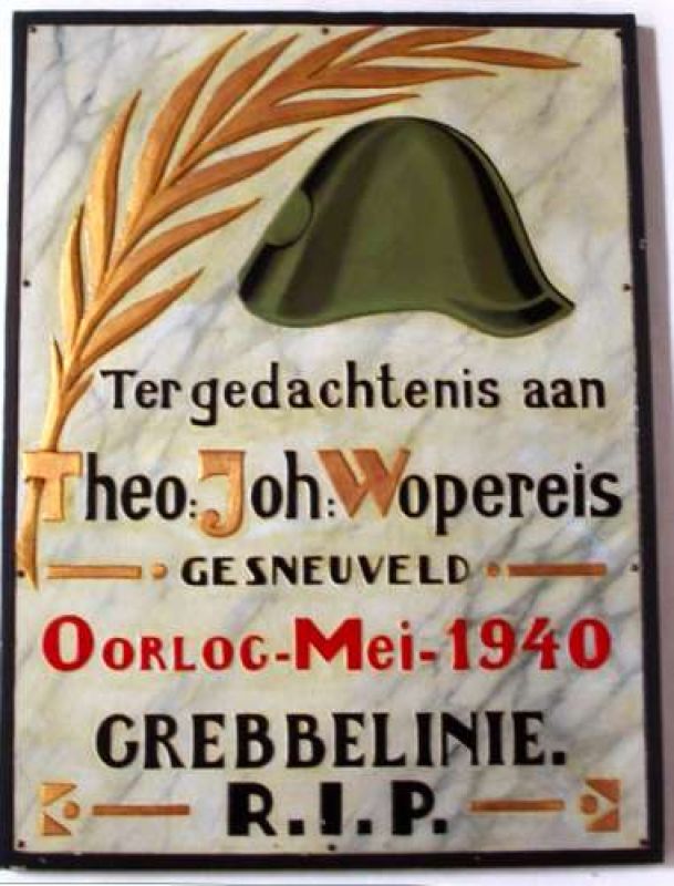 Theo Wopereis (Vossnieders Theo) werd op 14 september 1917 geboren te Lichtenvoorde/Zieuwent. Hij vocht vanaf 10 mei 1940 als soldaat bij het II-8 Regiment Infanterie op de Grebbeberg. Op 13 mei 1940 werd hij daar geraakt door granaatscherven en bloedde dood.