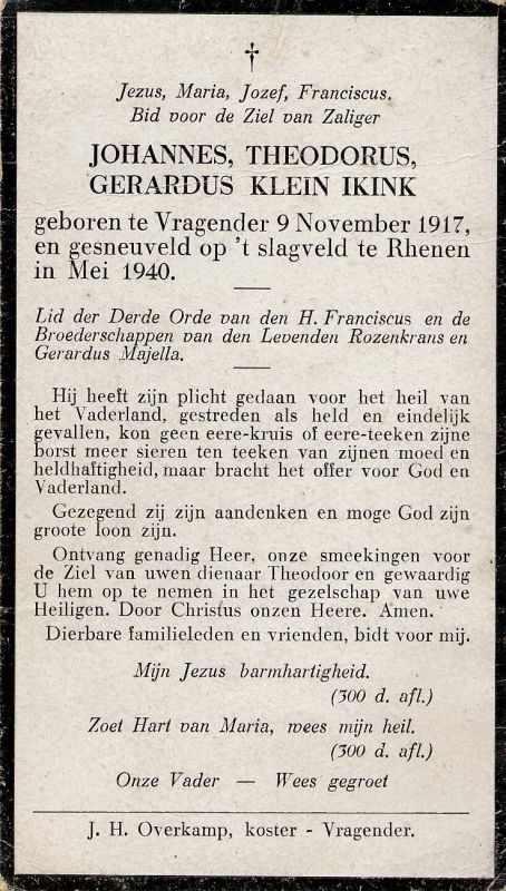 Theo Klein Ikink werd op 9 november 1917 geboren op boerderij Klein Ikink aan de Heelweg in Vragender. Op de Grebbeberg vocht hij vanaf 10 mei 1940 bij het II-8 regiment infanterie tegen de Duitsers. Bij het ophalen van munitie in Amerongen werd hij op 13 mei 1940 door een sluipschutter gedood.