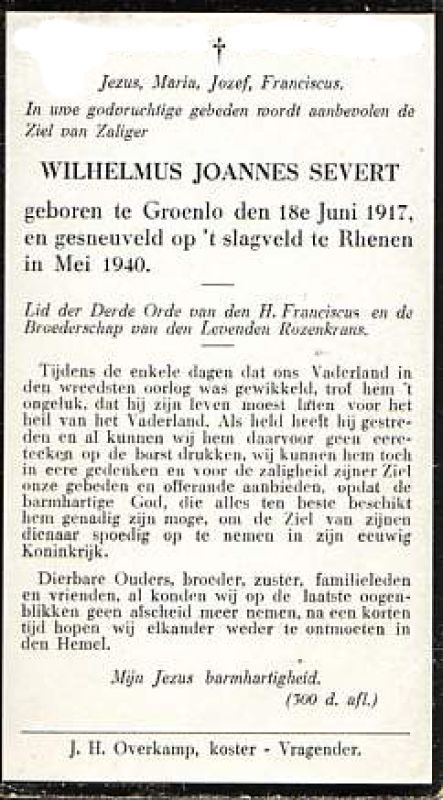 Willem Severt werd geboren in Groenlo en verhuisde in 1929 met zijn ouders naar boerderij “Teppert” aan de Kapelweg in Vragender. Tijdens de hevige gevechten van zijn onderdeel, het II-8 Regiment Infanterie, op 13 mei 1940 nabij de Grebbeberg raakte hij gewond door een verdwaalde Nederlandse kogel. Op weg naar het nabijgelegen hospitaal werd hij dodelijk getroffen door drie Duitse kogels.